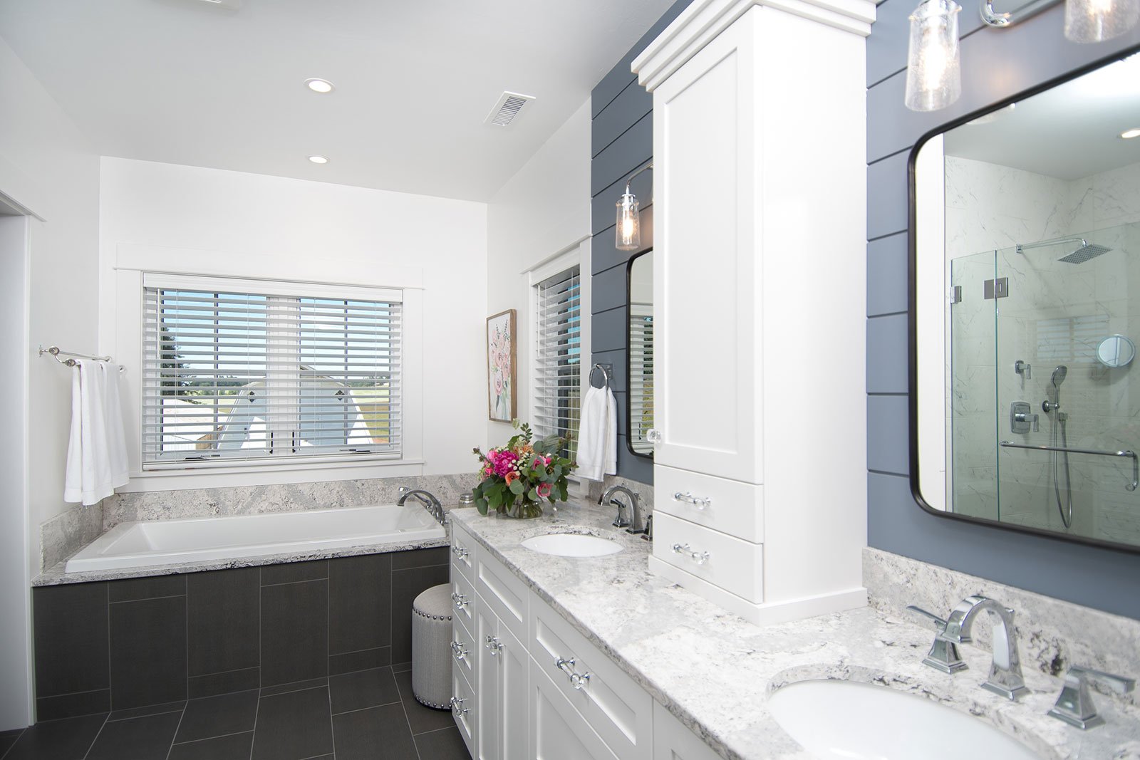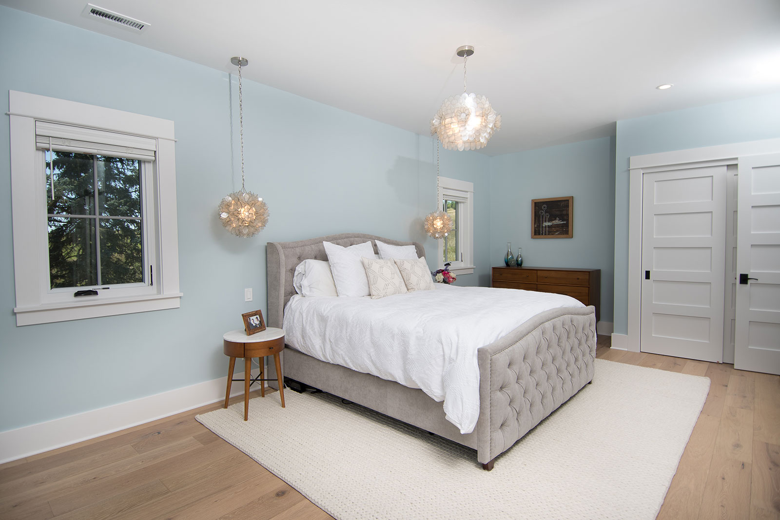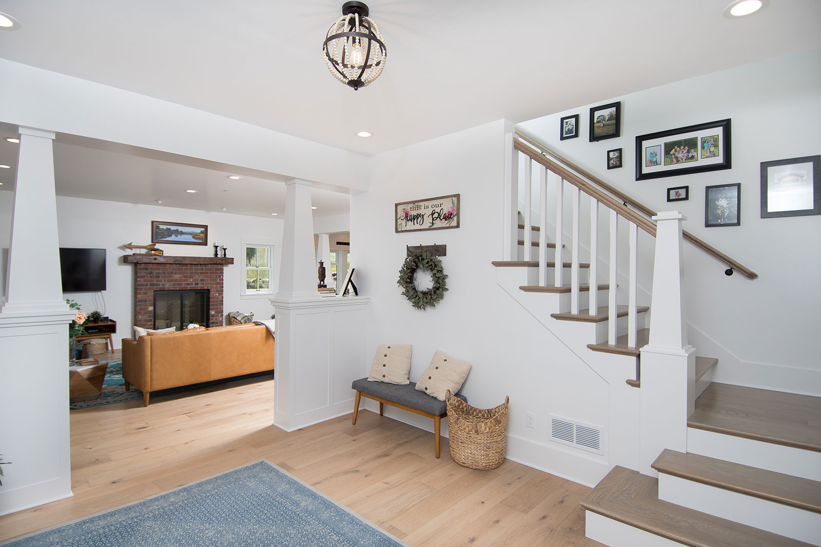 The design of the new construction is greatly influenced by the old home with traditional craftsman design interiors. We worked with a deconstruction specialist to salvage the old-growth timber and reused or re-purposed many of the original materials. We moved the house back on the property, connecting it to the existing garage, and lowered the elevation of the home which made it more accessible to the existing grades. The new home includes 5-panel doors, columned archways, tall baseboards, reused wood for architectural highlights in the kitchen, a food-preservation room, exercise room, playful wallpaper in the guest bath, and fun era-specific fixtures throughout.