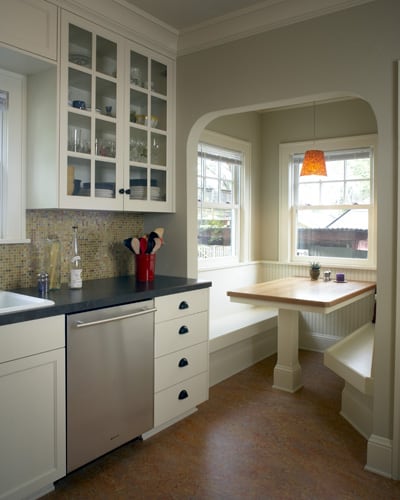 When the homeowners of this old Craftsman purchased the home, it needed to be gutted and extensively remodeled due to years of neglect and poor fix jobs. We restored the living room and dining room with new plaster, baseboards and crown molding, and the whole kitchen was remodeled to include a breakfast nook. The master bathroom expansion featured a custom, handmade tile shower and new vanity, as well as custom cabinetry in the master bedroom to fit around the window casing. Many eco-friendly products and green-building practices were used throughout this remodel, such as Marmoleum flooring in several rooms. For added energy efficiency, old paneling was removed and new low-E windows were installed, leaky duct work was replaced, water-saving fixtures were put in place, and much of the demolished woodwork was recycled.